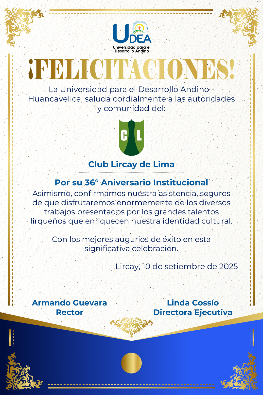 La Universidad para el Desarrollo Andino (UDEA) participó en la celebración por el 36° Aniversario del Club Lircay de Lima, una importante institución que reúne a la comunidad lirqueña en la capital y que año tras año resalta nuestras tradiciones …