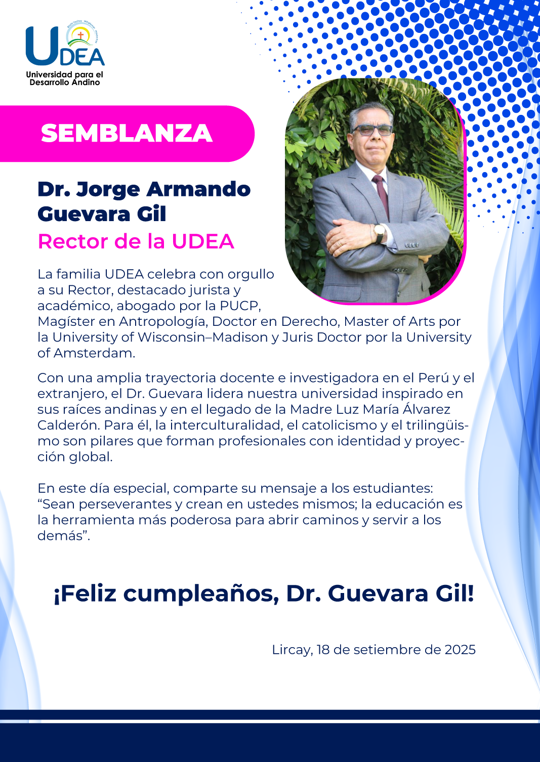 La Universidad para el Desarrollo Andino celebra con orgullo y gratitud a su Rector, Dr. Jorge Armando Guevara Gil. Abogado por la Pontificia Universidad Católica del Perú (PUCP), Magíster en Antropología y Doctor en Derecho, obtuvo además el grado de …