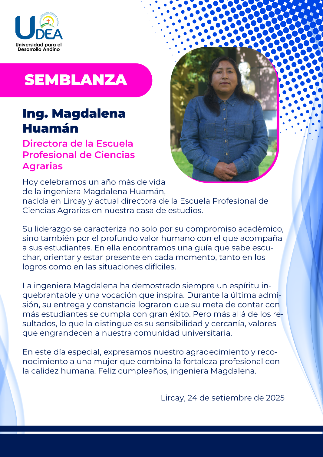 Hoy celebramos la vida de la ingeniera Magdalena Huamán, una mujer nacida en Lircay que, con esfuerzo y dedicación, se ha convertido en un pilar fundamental de nuestra universidad. Actualmente dirige la Escuela Profesional de Ciencias Agrarias, y lo hace …